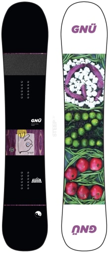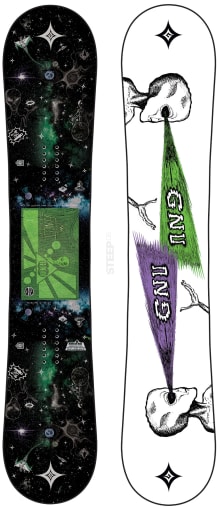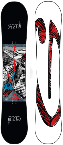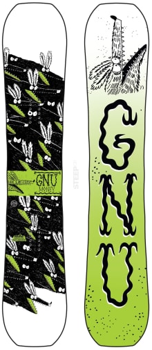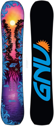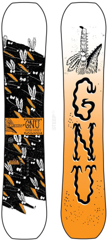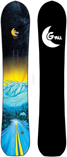 "Gnu brings you one board to rule the whole resort. Asymmetric twin geometries speed your freestyle progression in any direction on every turn, berm, bump and booter you find. Poppy, floaty C2e hybrid contours and serrated edge technology float the pow, rip the hardpack and everything else you drop into."