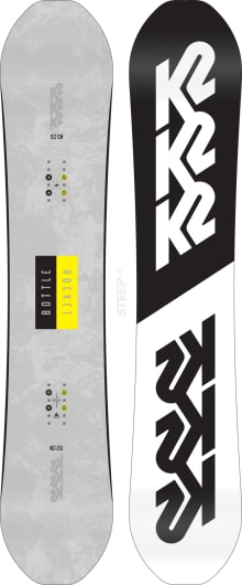 "Built on a mid-wide outline, the K2 Bottle Rocket sits atop a BAP Core and Twin Rocker Baseline™ that make the entire resort feel like a skatepark. Ollie Bar™ and Triax ICG 20 Carbon Glass make the Bottle Rocket Snowboard poppy and energetic; while the Carbon Torque Forks™ increase edge..."