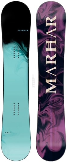 "The Aura womens freestyle snowboard has perfect soft flex and extra carbon fiber pop and stability for balanced all terrain fun snowboarding. The Aura is lightweight, surfy and has easy smooth edge to edge maneuvering while the Dual Arc edges create edge grip. Take this versatile snowboard from pressing rails..."